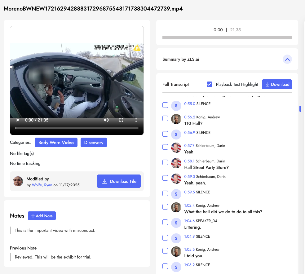 In ZLS.app, smart speaker labels start with AI detecting distinct voices on a jail call or body cam video. You then assign each “SPEAKER_00”–style label to an actual person from your Case People list. Once you link “SPEAKER_01” to “Officer Konig” or “Client,” every line that voice speaks updates across the transcript in one step. Suddenly the text reads less like a machine dump and more like a deposition: